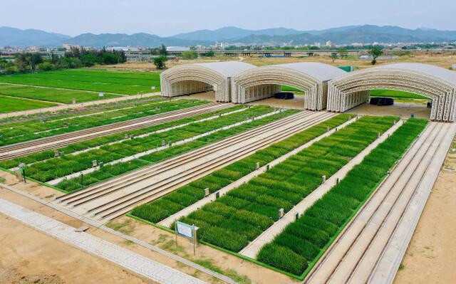 12月18日午后,三亚崖州湾科技城的国家耐盐碱水稻技术创新中心科研试验基地里。一排白色的大型钢架折叠棚旁,360个3平方米大小的方格里,种植着500多个带有不同编号的耐盐碱水稻样本。
