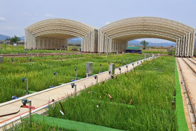 “这是全球领先的室外多盐度水稻耐盐性精准鉴定平台,大棚上安装了雨感器,晴天大棚会自动折叠,下雨了大棚会自动打开,每一个小方格的盐度都可以精准调控。”艾治勇说,不同于普通水稻科研,耐盐碱水稻科研要求田块里的盐度可控,才能确保实验数据精准、科研成果有效。